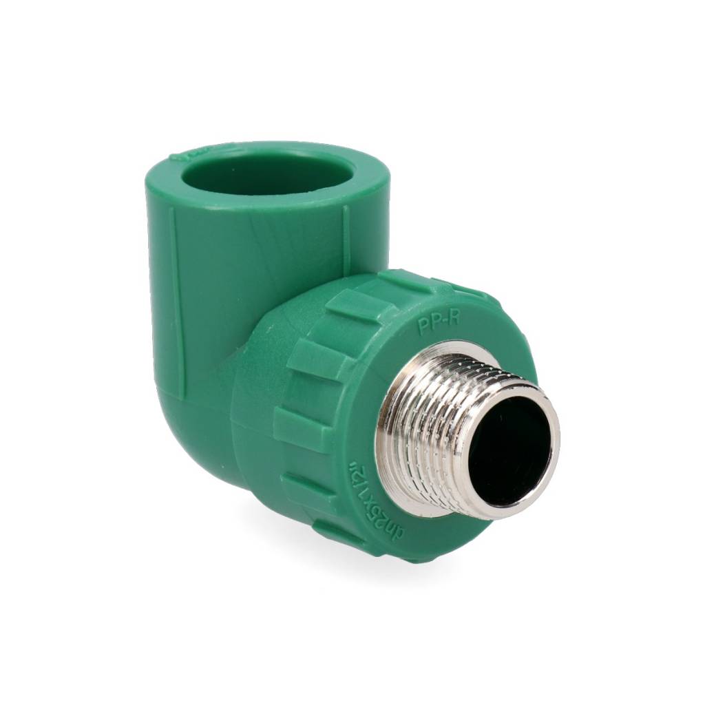 Codo terminal de termofusión en color verde con conexión macho de 1/2 pulgada. Diseñado para terminaciones en tuberías, garantizando sellado hermético.