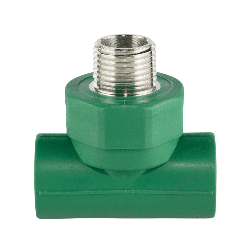 Pieza en forma de T terminal de termofusión en color verde con conexión macho de 3/4 pulgada. Diseñada para terminaciones en sistemas de tuberías, garantizando conexión segura.